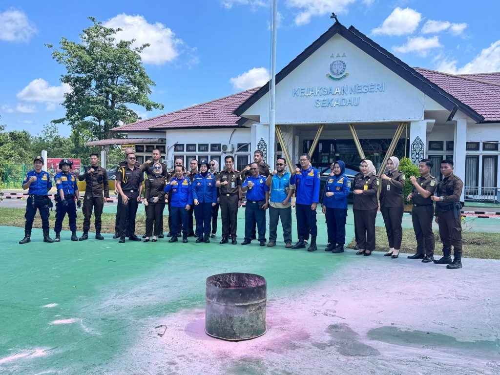 Foto bersama usai simulasi penggunaan APAR di halaman Kantor Kejaksaan Negeri Sekadau. Kegiatan diikuti oleh Kejaksaan Negeri Sekadau, PLN ULP Sekadau, dan Pemadam Kebakaran Sekadau.(FOTO/DOK/PLN)