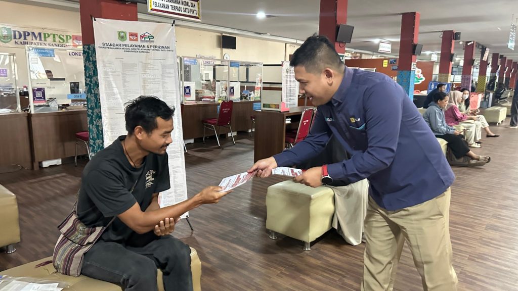 Petugas PLN UP3 Sanggau, sedang melakukan pembagian brosur dan menjelaskan terkait promo diskon 50% tambah daya bertajuk “Energi Kemerdekaan” di Mall Pelayanan Publik (MPP) Kabupaten Sanggau.