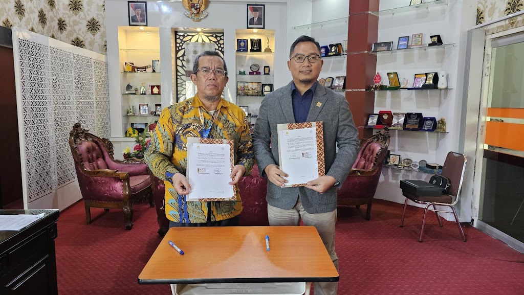 Foto bersama setelah penandatanganan Memorandum of Understanding (MoU) terkait pemasangan SPLU dan SPLU antara Dekan Fakultas Keguruan dan Ilmu Pendidikan (FKIP), Dr Ahmad Yani T, M.Pd. ((kiri) dan Manager PLN…